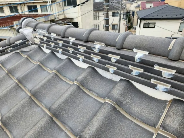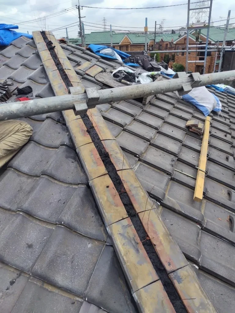 瓦の一部や棟の一部をコーキングすることで固定し災害の対策にもなりますが築年数が長く下地が劣化していたり棟瓦が歪んでいる場合は既存の瓦を使って原因箇所の根本から施工することをおすすめします。