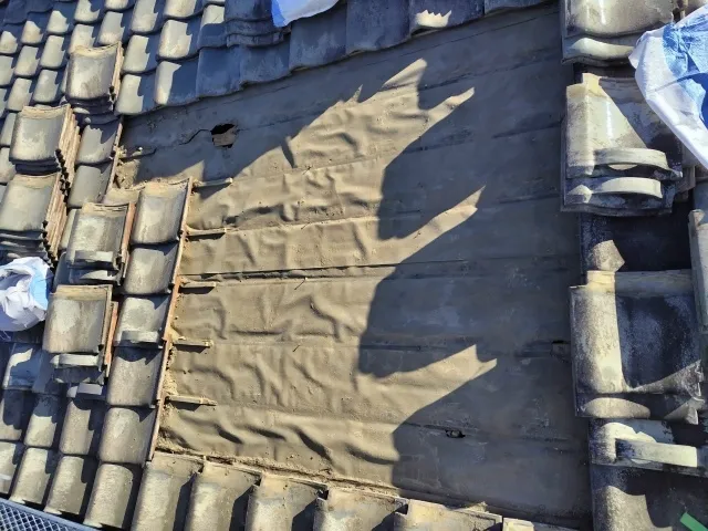 まず、古い瓦を取り外し、屋根の下地を確認。