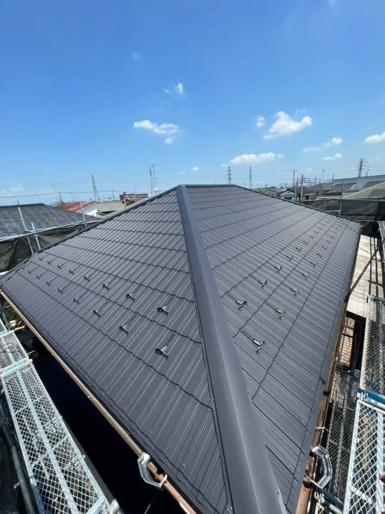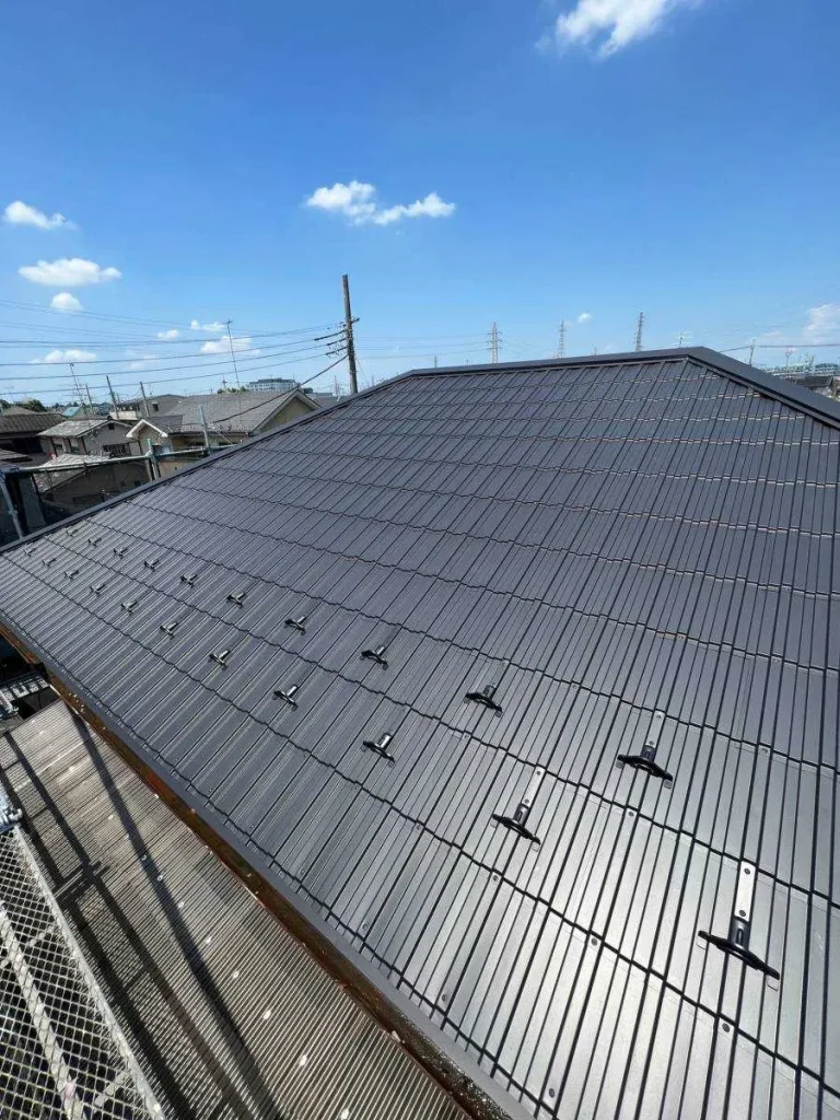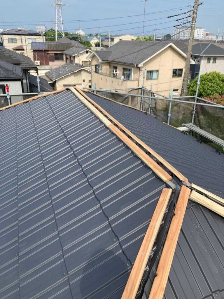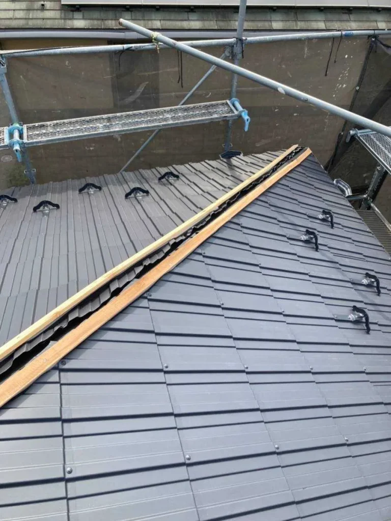 屋根の劣化、棟板金の破損があり、カバー工法で検討されたためレクトルーフを提案。