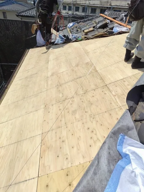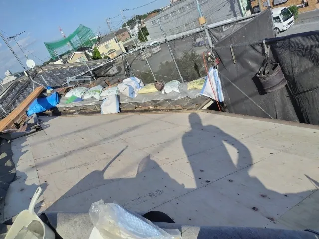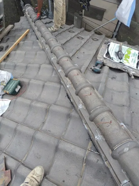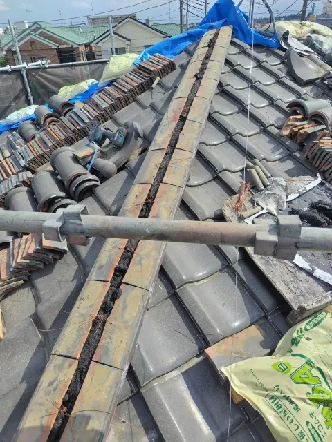 棟瓦を撤去、コーキング撤去、1面ずつ防水シート敷いて雨漏りがないように注意しながら施工いたしました。