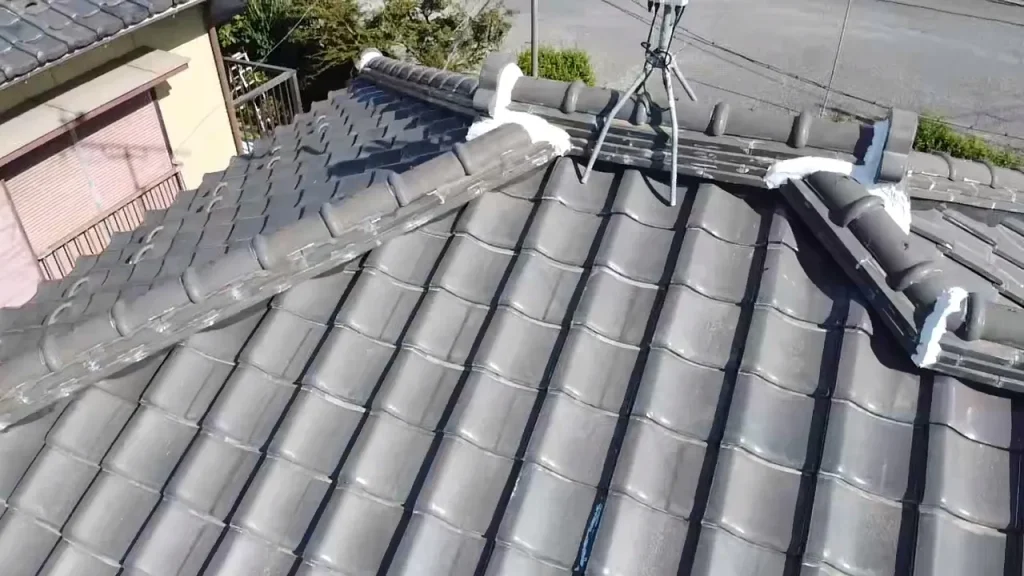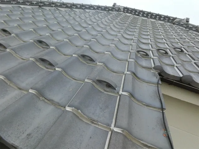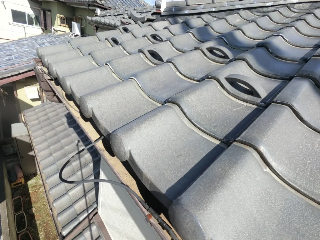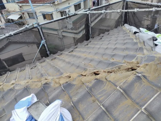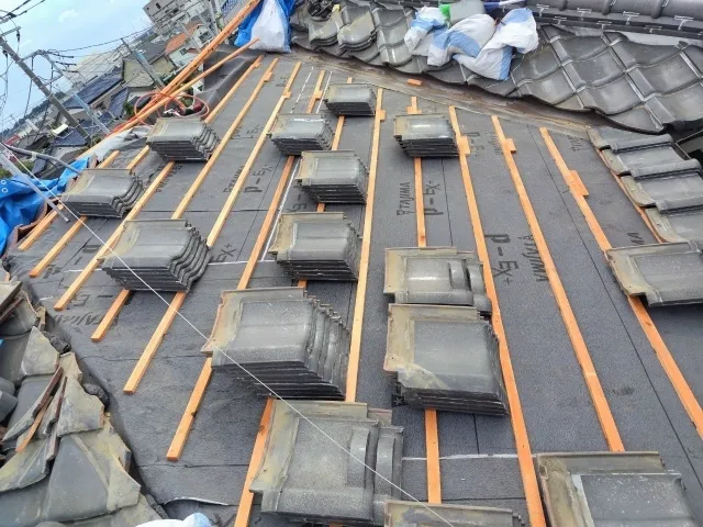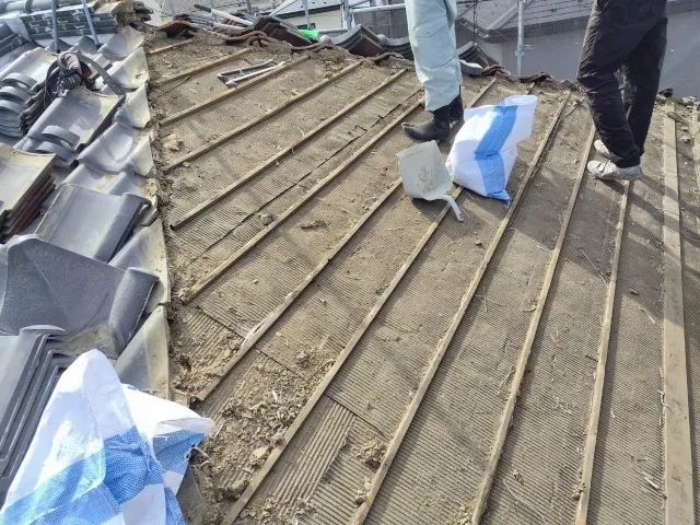雨漏りの相談から屋根を診断したところラバーロック工法(瓦全体をコーキングする)されていて雨水が排出されづらくなっていたため診断説明し、許可を得てコーキングを一部撤去し下地のルーフィング(防水シート)が劣化しているのため、葺き直しを行いました。