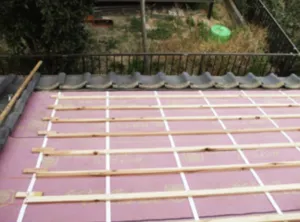 続いて、屋根の基礎の板に異常な劣化がないか確認し、新しい防水材と桟木を取り付けていきます。